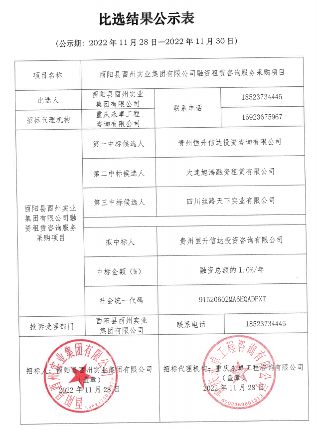 酉陽縣酉州實業集團有限公司融資租賃咨詢服務采購項目比選結果公示表